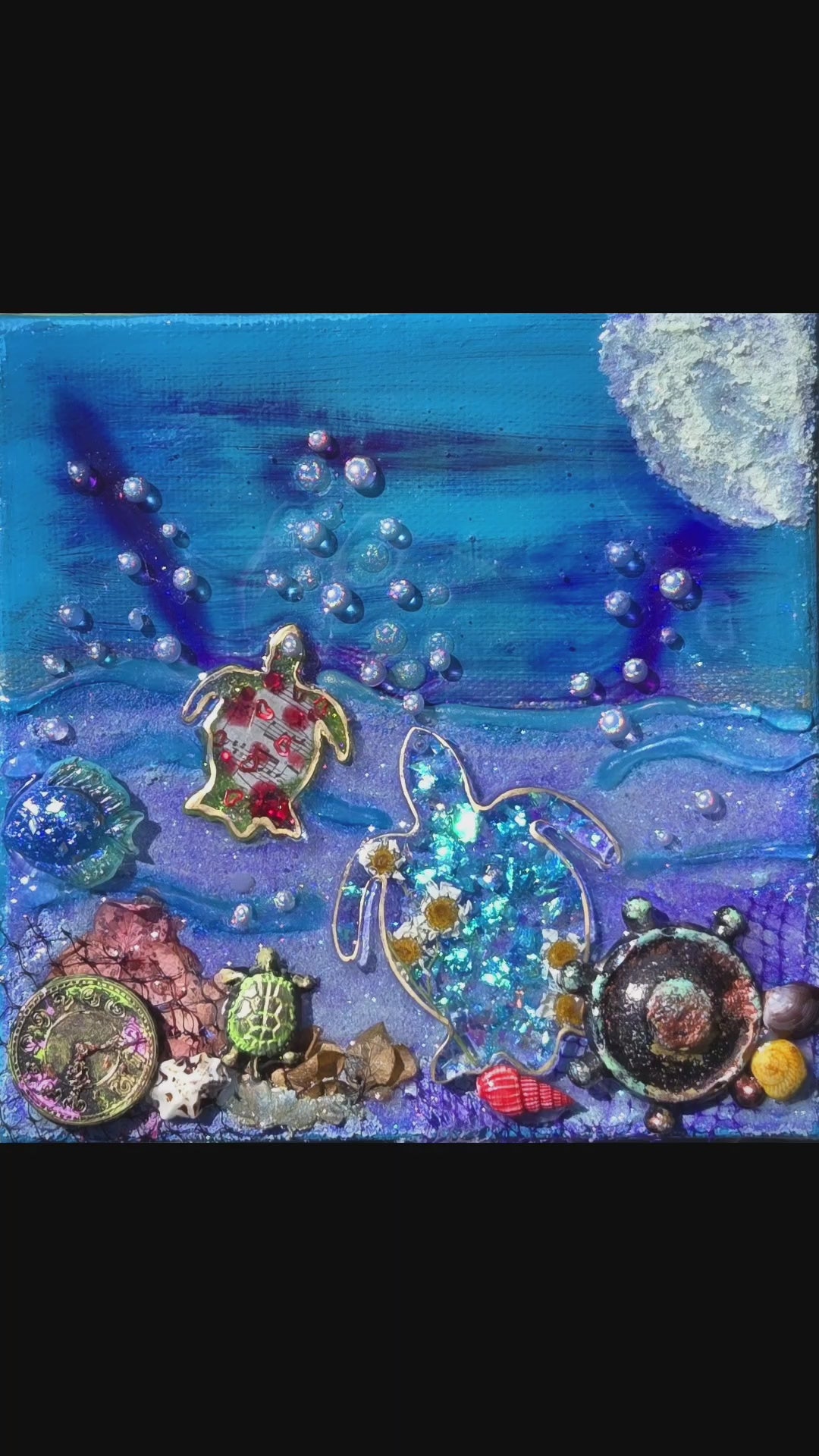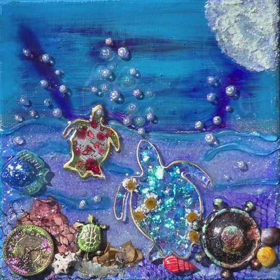 Escape to a glowing ocean at night with my one-of-a-kind 3D mixed media art. Handmade aged elements with real sea shells. This 6x6 chunky canvas is a treat for the senses. Glows under UV light.
